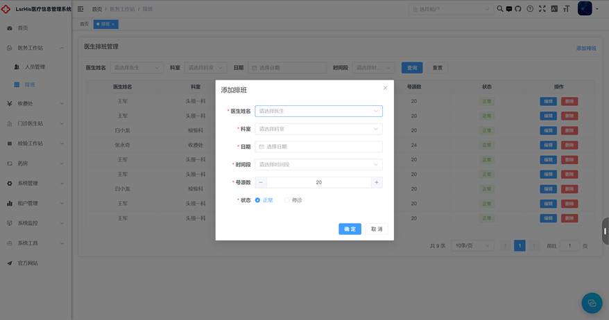 完成医院医生的日常排班工作,以便于患者去挂对应的医生的号。医生姓名、科室向后端发送请求进行获取。时间段设置为上午、下午、晚上、全天,可以根据客户医院具体的工作时间去调整。