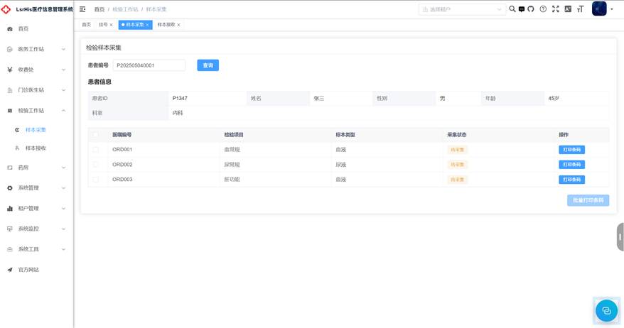 4、检验科:为患者执行检验医嘱。首先是根据医嘱对患者进行采集样本的操作并打印条码,其次是检验科对样本进行接收操作,接收后的样本会通过条码的医嘱信息再通过医嘱项目与测试项目的对照,获取到具体的测试项目,检验科的医师可以填写检验结果,当检验结果与仪器上的无误之后,便可以点击审核样本。检验科人员也要维护好医嘱项目于测试项目的对照。