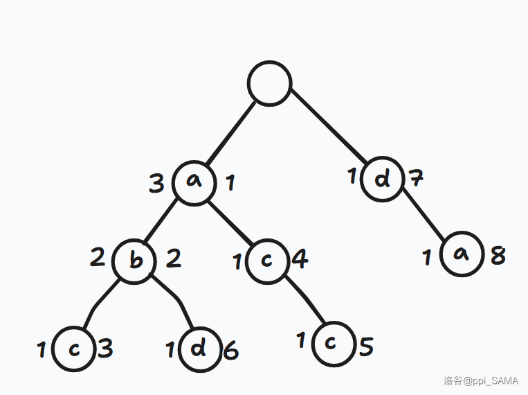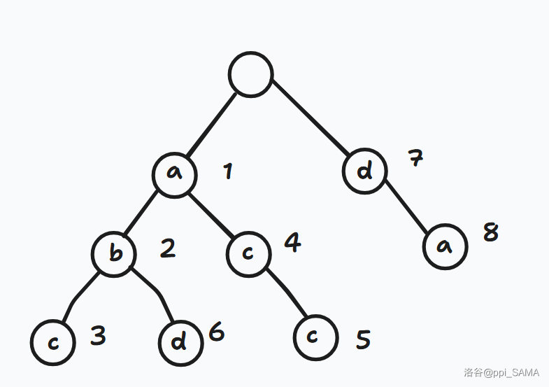 此时,可以构建出以下的一棵树,并且以每个字符出现顺序编号