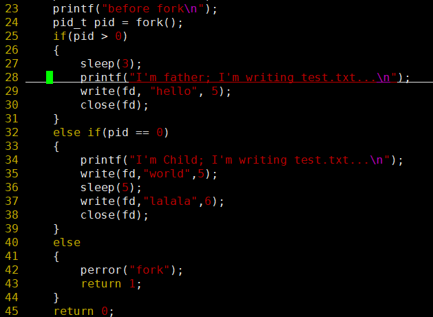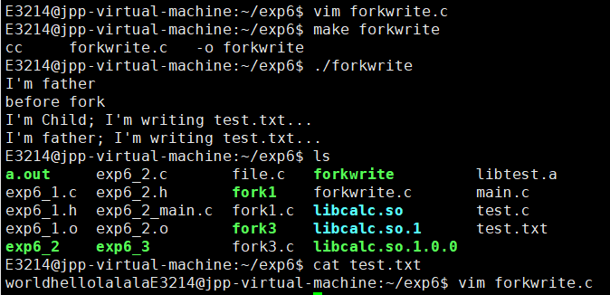 6.在 fork 之前以写的方式创建了一个文件 test.txt。然后 fork 出的子进程立即向文件中写入“world”,然后睡眠5秒。而父进程在 fork 后睡眠3秒后向 test.txt 写入 "hello",并关闭描述符。子进程恢复后,又向 test.txt 文件中写入 "lalala"后关闭描述符,结束。