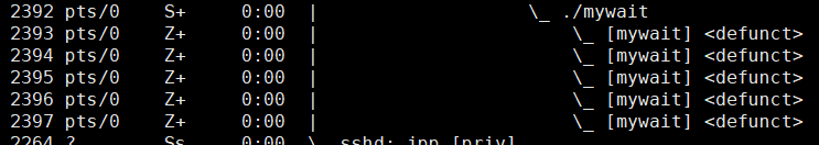 8.创建5个僵尸进程,并在终端通过 ps axf 命令查看僵尸进程信息。