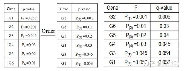 举个例子,如果我们有总共六个结果进行FDR校正: