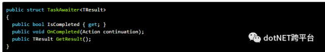 awaitable的GetAwaiter()可以是实例方法,也可以是扩展方法。该方法返回的是一个awaiter,该awaiter必须实现INotifyCompletion接口,可选实现ICriticalNotifyCompletion接口,同时,必须提供一个名为IsCompleted bool 属性, 必须提供public TResult GetResult()方法。