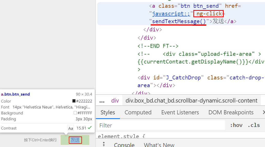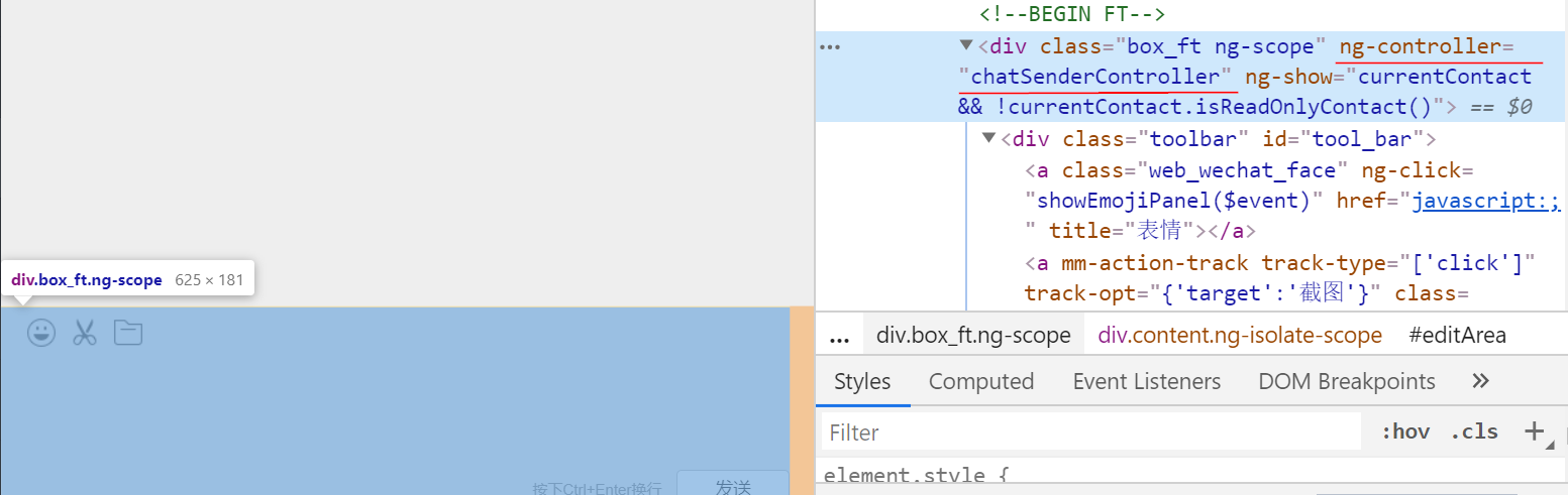 这里它的参数 '[ng-controller=chatSenderController]' ,我们可以检查一下微信网页的元素,如图。 可以看出应该是一个与聊天输入区域有关的东西。