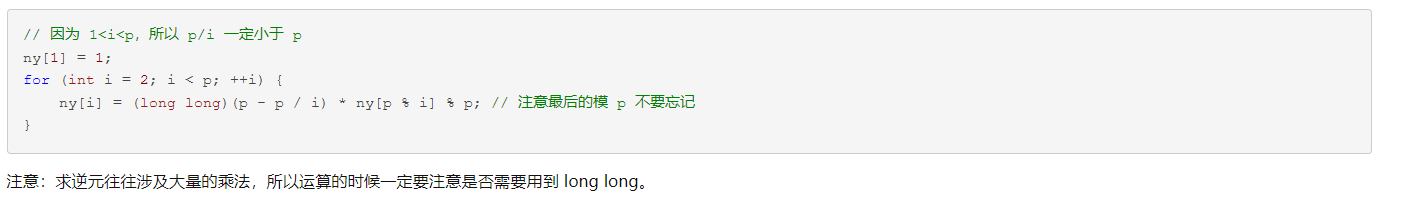 \[ny1[i]=(LL)(p-p/i)*ny1[p \% i] \% p; \]\[ny2[i]=(LL)(ny2[i-1]*ny1[i] \% p; \]