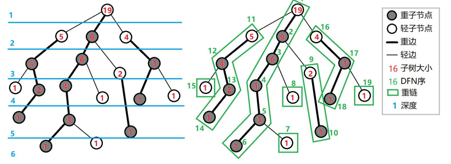 \(dfs\) 两次,第一次找 \(son\),维护\(sz,dep,fa\),找出重儿子。