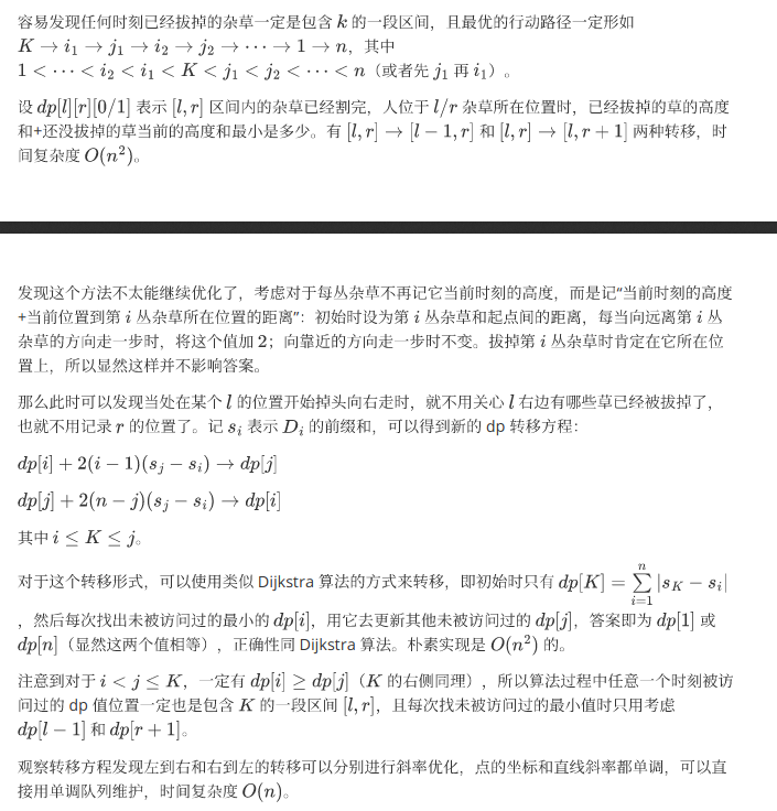 假如有两个点 \(l \le k \le r\),那么从 \(r\) 走到 \(l\) 会使 \([r+1,n]\) 的每棵草贡献加二倍的 \(dis_{l,r}\)。从 \(l\) 到 \(r\) 同理。