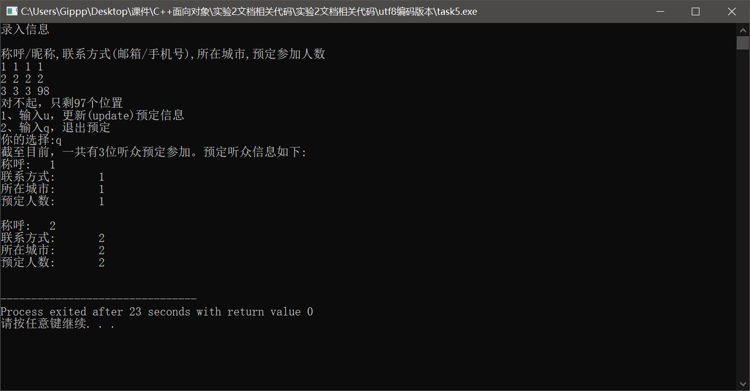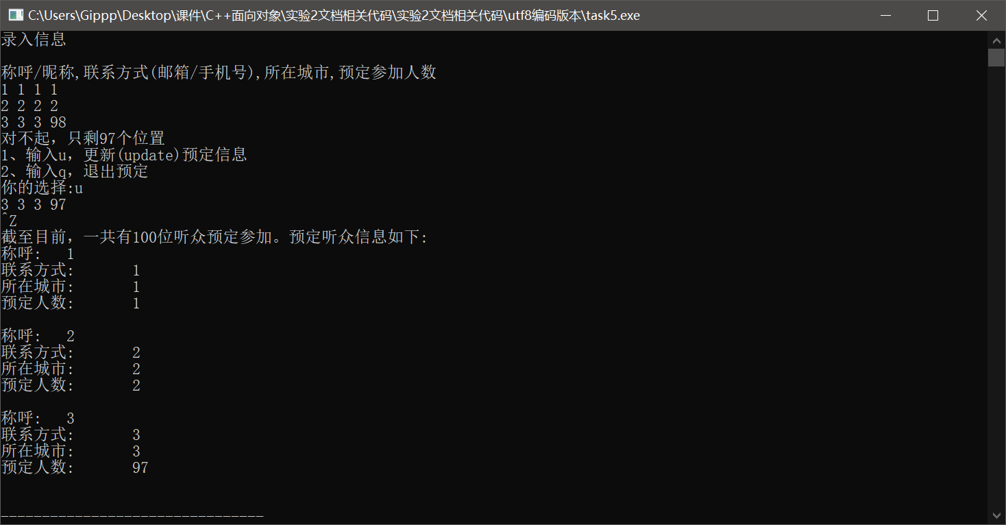 #include"info.hpp" #include<iostream> #include<string> #include<vector> using namespace std; int main(){ const int capacity=100; vector<info> audience_info_list; cout<<"录入信息"<<endl<<endl; cout<<"称呼/昵称,联系方式(邮箱/手机号),所在城市,预定参加人数"<<endl; string nickname,contact,city; int n,sum=0; while(cin>>nickname>>contact>>city>>n){ if(sum+n>capacity){ cout<<"对不起,只剩"<<capacity-sum<<"个位置"<<endl; cout<<"1、输入u,更新(update)预定信息"<<endl; cout<<"2、输入q,退出预定"<<endl; cout<<"你的选择:"; char op; cin>>op; if(op=='u')continue; else break; } info p(nickname,contact,city,n); audience_info_list.push_back(p); sum+=n; } cout<<"截至目前,一共有"<<sum<<"位听众预定参加。预定听众信息如下:"<<endl; for(auto x:audience_info_list){ x.print(); puts(""); } }