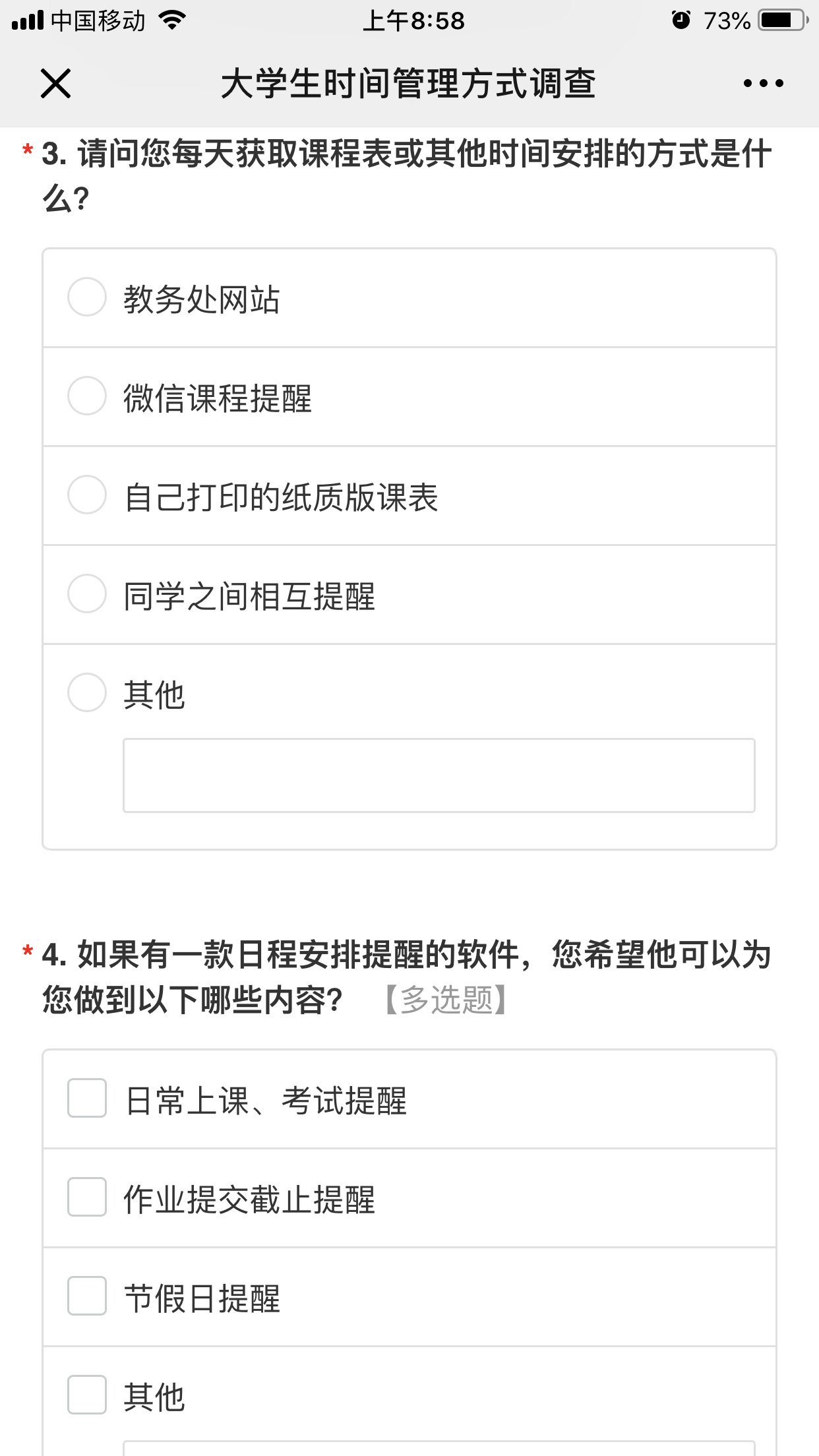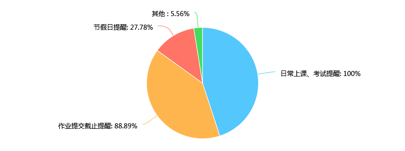 3)多数调查对象的时间安排仍然被限制在课堂上,所以对教学服务、考试提醒、作业截止时间等的需求仍然较高,设计软件时可以主要从这些方面考虑并以此为主进行扩展。