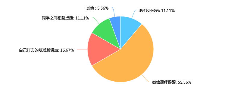 2)从结果来看,调查对象获得时间安排的方式主要来自于微信课程提醒和“课程格子”等app的使用,二者之和占据了50%已以上,此外仍然存在少部分同学因为纸质材料的方便,可靠,不需要随时随地联网的特性而使用纸质课表的现象。