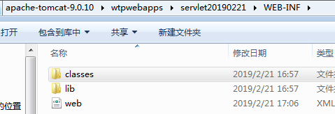 2. 该工程部署在tomcat容器中后,会在webapps目录下 有该项目工程;在src目录下的文件 都会在tomcat容器的apache-tomcat-9.0.10\wtpwebapps\servlet20190221\WEB-INF\classes的目录中,如下图: