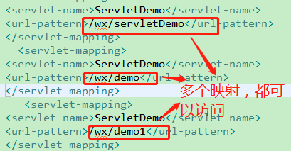 注:同一个Servlet可以被映射到多个URL上,即多个<servlet-mapping>元素的<servlet-name>子元素的设置值可以是同一个Servlet的注册名: