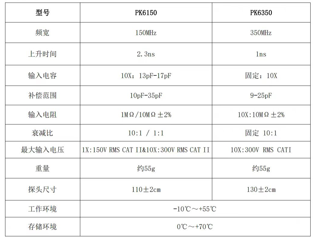 图2 PK6000系列无源探头的性能指标