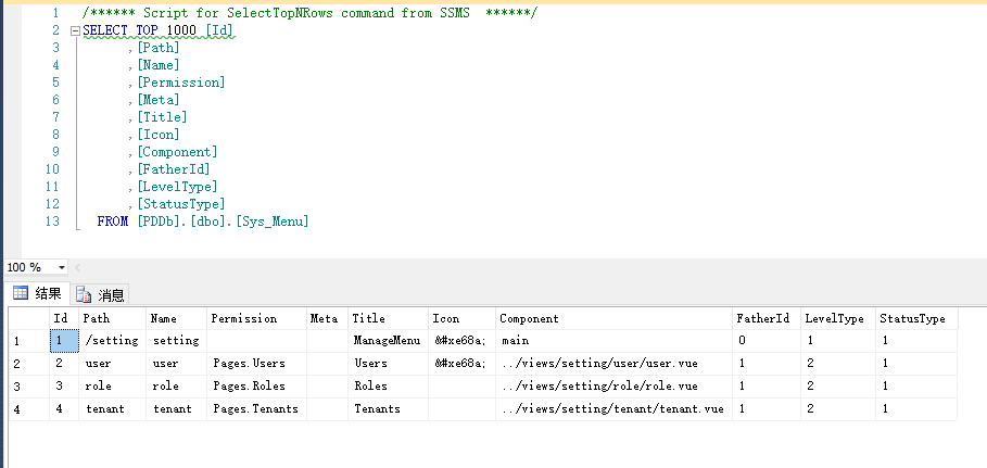 INSERT [dbo].[Sys_Menu] ([Id], [Path], [Name], [Permission], [Meta], [Title], [Icon], [Component], [FatherId], [LevelType], [StatusType]) VALUES (1, N'/setting', N'setting', N'', N'', N'ManageMenu', N'', N'main', 0, 1, 1)
