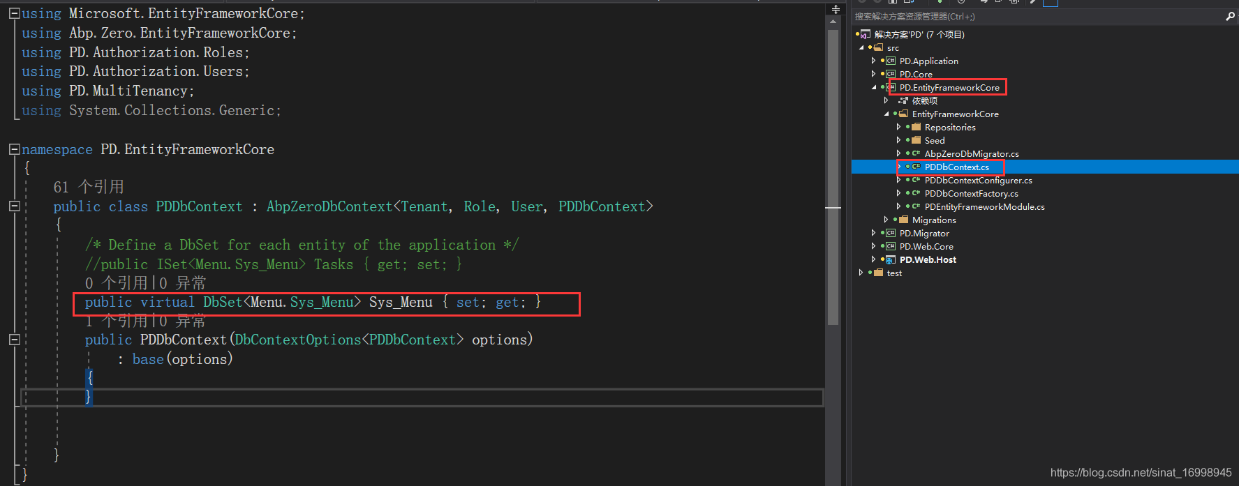 public class PDDbContext : AbpZeroDbContext<Tenant, Role, User, PDDbContext>