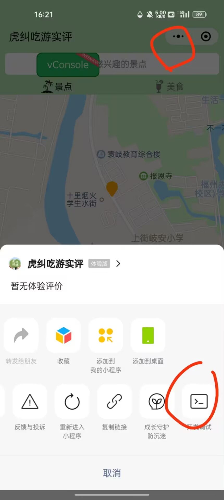 (由于小程序类目个人开发者受限及无法通过认证,无法通过审核并发布小程序,扫码进入体验版后请点击右上角…,选择开发调试-打开调试,即可测试)