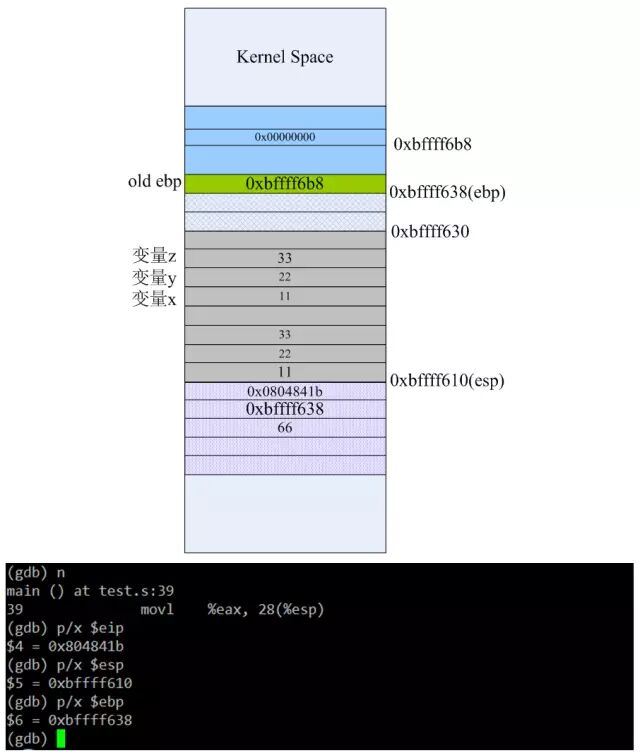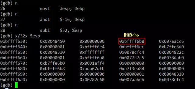 行完上述三条指令后栈里的数据如上图所示,从0xbffff630到0xbffff638的8字节是为了实现地址对齐的填充数据。此时ebp的值0xbffff638,该地址处存放的是ebp原来的值0xbffff6b8。详细布局如下: