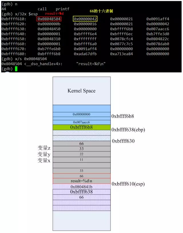 第39条指令就相当于给main里的result变量赋值66,如上红线标注的地方。接下来main函数里要执行printf(“result=%d\n”,result)语句了,而printf又是C库的一个常用的输出函数,这里就又会像前面调用foo1那样,初始化栈,然后用“call printf的地址”来调用C函数。当40~43这4条指令执行完后,栈里的数据如下:
