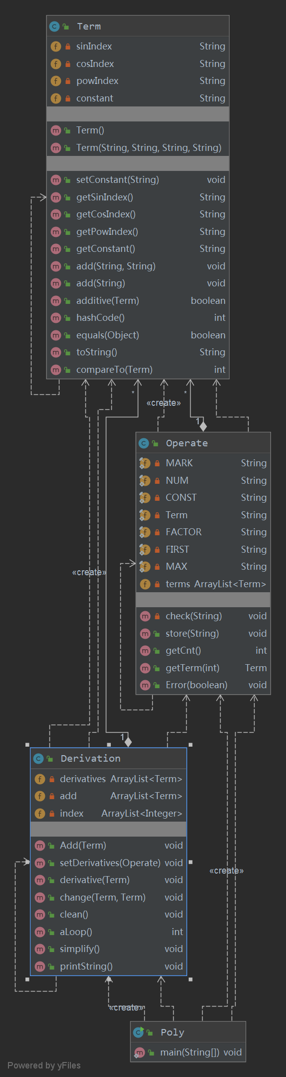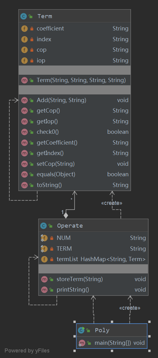 嵌套和循环调用:Poly类既是存储整个表达式的类,又是继承factor,作为一个因子的类。