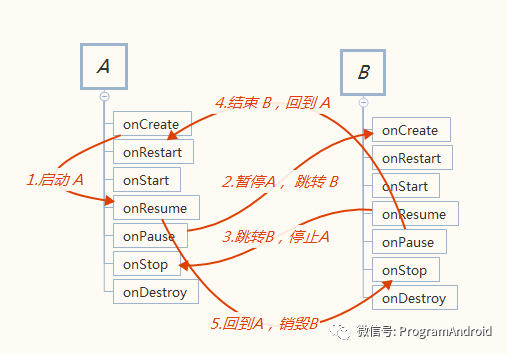 1. Activity A 启动 Activity B, 然后再返回A,简述一下 A与B生命周期的调用方法。