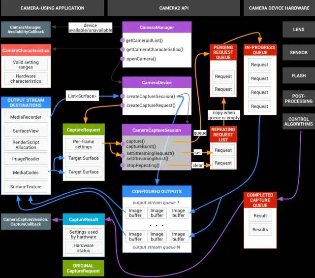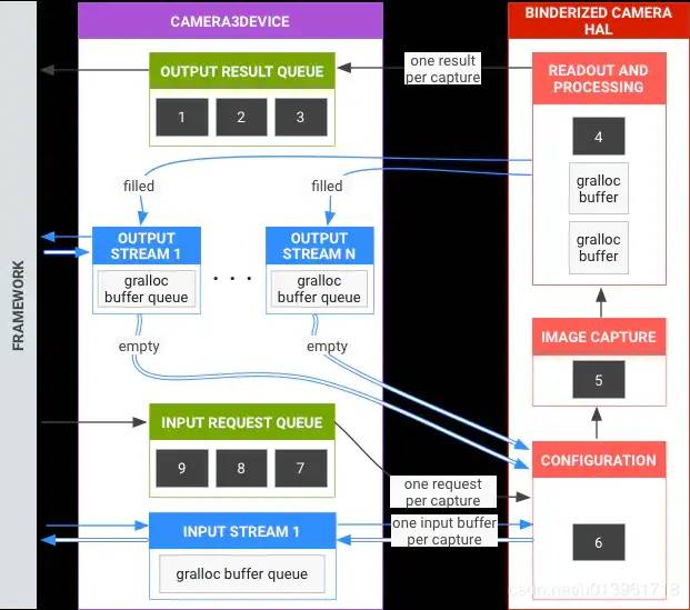 每个request都需要携带target surface用于指定返回的图像是归属到哪个被configure的stream的。request处理流程(橙色箭头线条)