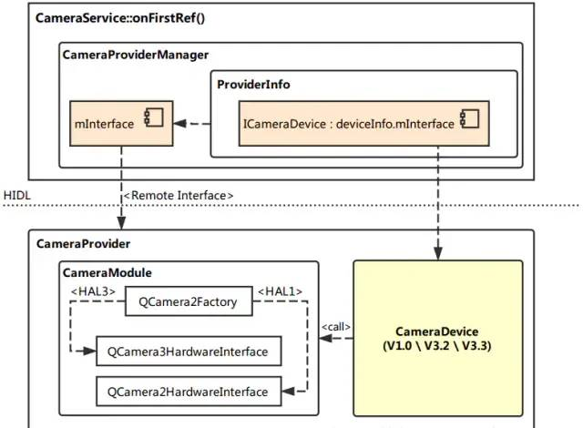 在 Android O 中,系统启动时,会启动一个 CameraProvider 服务,它是从 cameraserver 进程中分离出来,作为一个独立进程 android.hardware.camera.provider@2.4-service 用来控制 camera HAL,cameraserver通过 HIDL 机制于camera provider进行通信。HIDL源自于 Android O 版本加入的 Treble 机制,它的主要功能是将 service 与 HAL 隔离,以方便 HAL 部分进行独立升级,类似于 APP 与 Framework 之间的 Binder 通信机制,通过引入一个进程间通信机制而针对不同层级进行解耦(从 Local call 变成了 Remote call)。如下图: