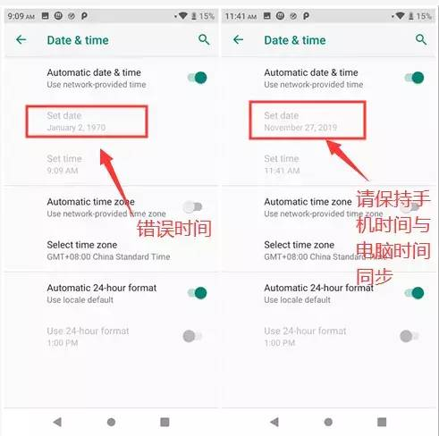 进入 Settings,找到System,然后找到Data & time,调节手机时间与电脑时间同步。