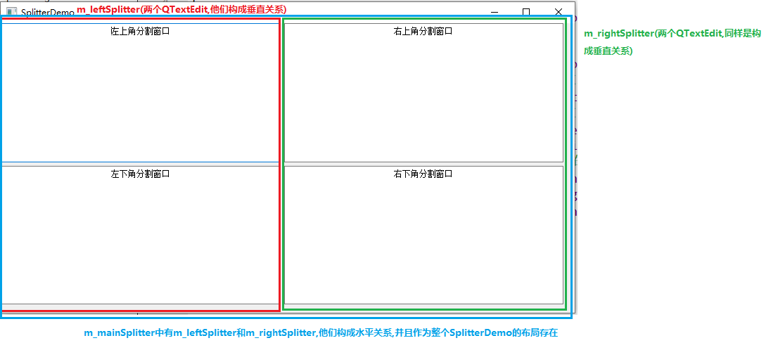 this->m_leftTopTextEdit = new QTextEdit(QString("左上角分割窗口"),this->m_leftSplitter);