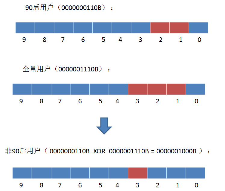 同样是刚才的例子,我们给定90后用户的Bitmap,再给定一个全量用户的Bitmap。最终要求出的是存在于全量用户,但又不存在于90后用户的部分。