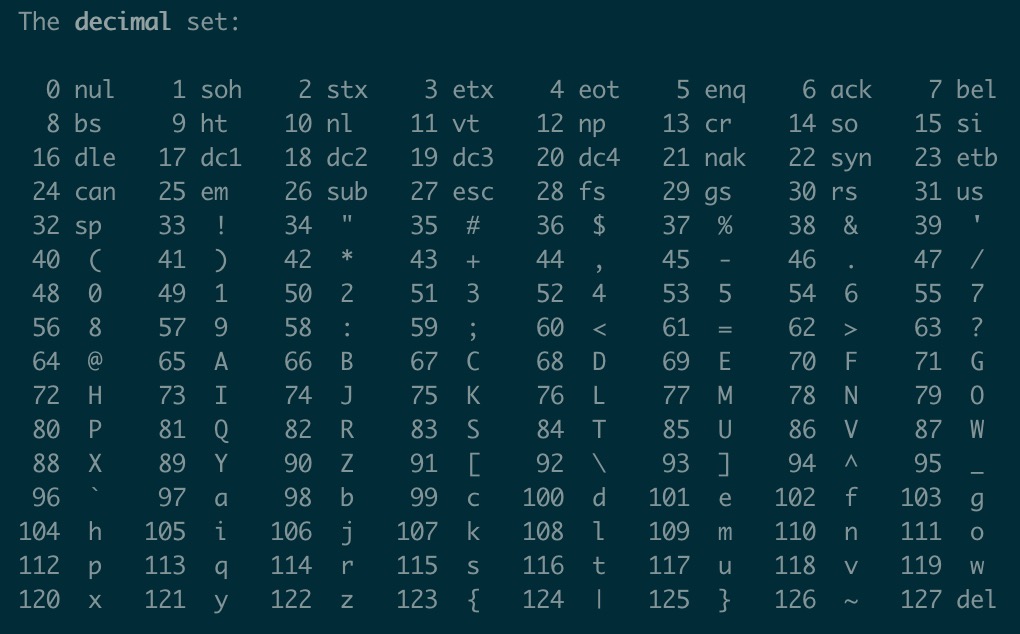 最早计算机发明的时候只用显示英文加一些符号,一个字节就够用了,这就是ASCII码,规定了一个字节范围类字符与二进制数值之间的映射关系,在终端下执行man ascii,即可看到下表。比如字符A对应的值是65二进制(01000001)。