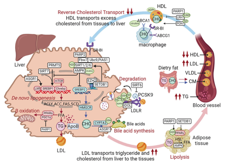 高脂血症指的是血液中脂肪和脂质水平异常升高,进而引发冠心病、心梗等心血管疾病,其原因是脂质的过量摄入和合成或分解代谢不足。然而,对于调节脂质代谢的PTMs,目前尚未完全解析,不同的PTMs通过不同的机制在调节脂质平衡中发挥的具体作用仍需进一步探讨。在肝脏新生脂肪生成期间,大量底物蛋白发生PTMs,如磷酸化(AMPK)、去乙酰化(SIRT1/2/6)、甲基化(EZH2,PRMT5)、泛素化(FBW7,ASGR1)、SUMO化(SUMO1,SENP1,UBC9,PIAS1)和ADP核糖基化(PARP2)。例如,SIRT1促使SREBP1c去乙酰化,进而引起SREBP1c泛素化降解,抑制脂肪酸和胆固醇合成。SENP1通过去SUMO化提高低密度脂蛋白受体的表达,有助于降低血液中LDL的浓度,从而减少高脂血症的风险。