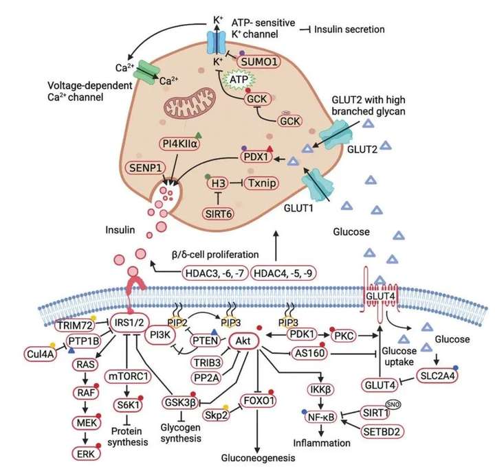 糖尿病类型众多,包括I型糖尿病、II型糖尿病以及妊娠糖尿病等。在对糖尿病的研究中发现,其与心血管疾病的发展进程也密切相关。糖尿病的病理生理过程由多重因素决定,这其中就包括由PTMs调控的信号级联反应。例如,各种激酶和磷酸酶调节葡萄糖刺激的胰岛β细胞的胰岛素分泌。PTMs可以连接糖异生、TCA循环和糖酵解,从而影响β细胞的活性和功能。例如,新型酰化修饰中的乙酰化由乙酰转移酶和去乙酰化酶调控,目前已证实年轻人成熟期糖尿病与组蛋白乙酰转移酶HAT和去乙酰化酶HDAC有关。