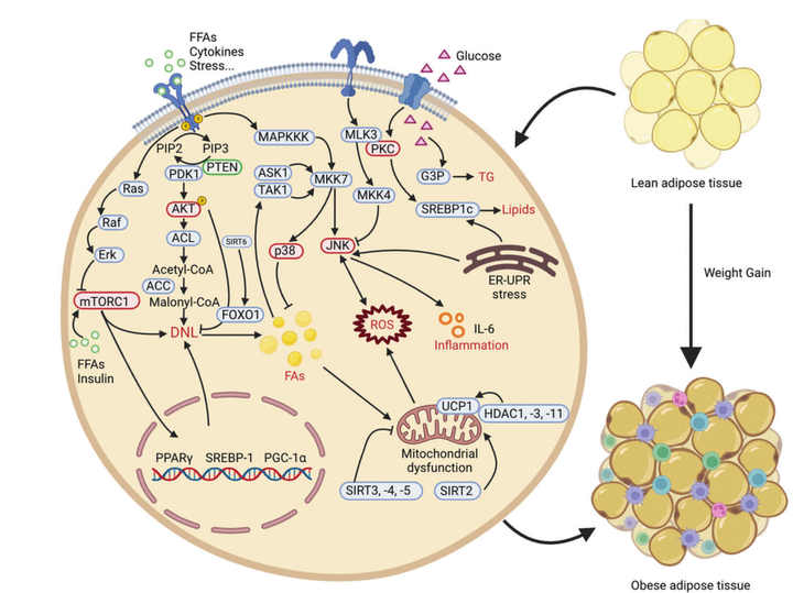 热量的过量摄入导致脂肪组织过度积累,进而引发肥胖,甚至引发糖尿病或者心血管疾病。在与肥胖相关的代谢性疾病中,与肥胖相关的酶或细胞因子的活性受到PTMs的调控。高脂肪和高葡萄糖水平可以触发胰腺β细胞分泌胰岛素和一系列激酶发生PTMs,进而生成脂肪酸,后者被脂肪组织吸收诱导肥胖。研究表明,蛋白质乙酰化与肥胖尤其相关。乙酰化是葡萄糖代谢、TCA循环和脂肪酸代谢等多种代谢途径的组成部分。HDAC家族蛋白可调控机体产热,从而抑制脂肪的消耗。