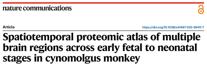 7月3日,来自昆明理工大学的司维、季维智院士及王正波团队联合在Nature Communications 发表了题为“Spatiotemporal proteomic atlas of multiple brain regions across early fetal to neonatal stages in cynomolgus monkey”的研究论文。该文章利用超灵敏时空蛋白质组学技术对食蟹猕猴不同发育阶段以及大脑的不同区域的156个样本进行了蛋白质组学分析,构建了食蟹猕猴从胎儿到新生儿大脑的时空蛋白质组学图谱,为大脑发育研究提供了重要的研究资源。景杰生物为该研究提供了时空蛋白质组学技术支持。