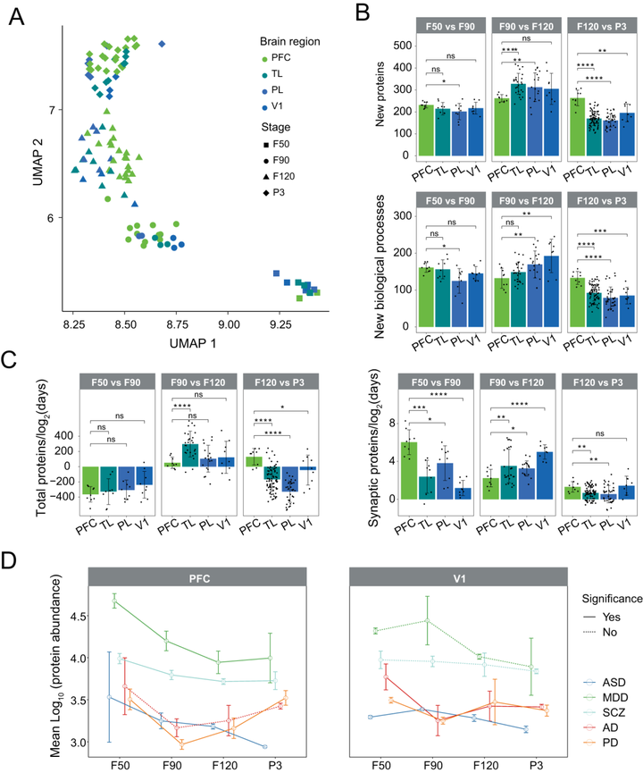 4. 皮质区域蛋白质组动态变化揭示疾病相关蛋白质研究者进一步比较不同区域的每两个相邻阶段的蛋白组变化,发现在胎儿大脑发育过程中(F120到P3),前额叶皮层(PFC)产生了比其他区域更多的新蛋白质,并且PFC中与神经精神疾病相关的蛋白质发生了显著变化。与神经退行性疾病(阿尔兹海默症和帕金森疾病)相关的蛋白质,其丰度从F90到P3阶段略有增加,并在胎儿大脑发育过程中的V1阶段发生显著变化。这一结果表明,这些疾病的发病机制可能是由于胎儿阶段“危险蛋白”的异常表达所致。
