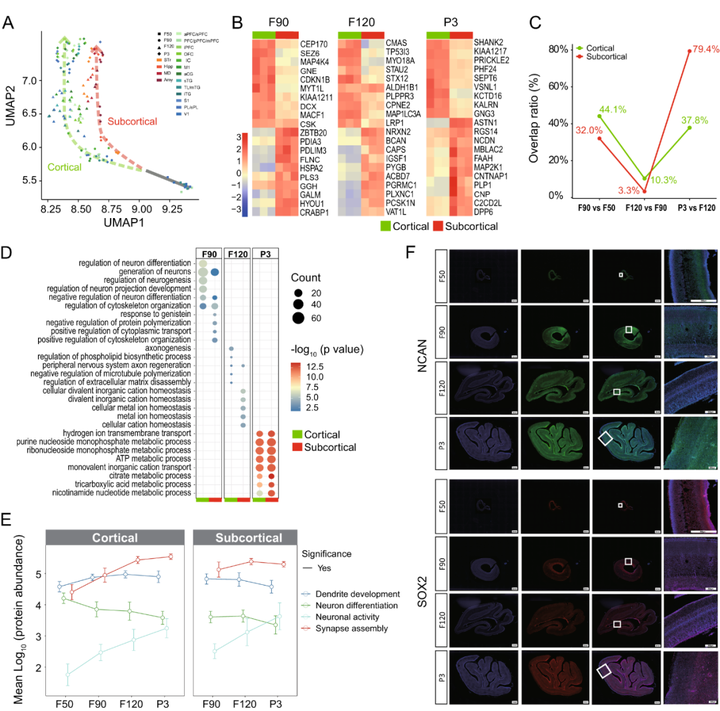 与此同时,研究者在大脑不同区域共鉴定到4856个差异表达蛋白。随着大脑发育的进展,皮质和皮质下区域之间的蛋白质组差异逐渐增大。F120阶段(相当于人类受精后32周)皮质和皮质下区域表现出独特的生物过程,表明该阶段可能会出现新的生物学过程来适应大脑结构和功能的变化。此外,由于小脑的蛋白质组成与大脑不同,研究者进一步探索了该区域在四个发育阶段的蛋白质组谱。结果表明,小脑中的蛋白质组在每个阶段都与其他大脑区域不同。
