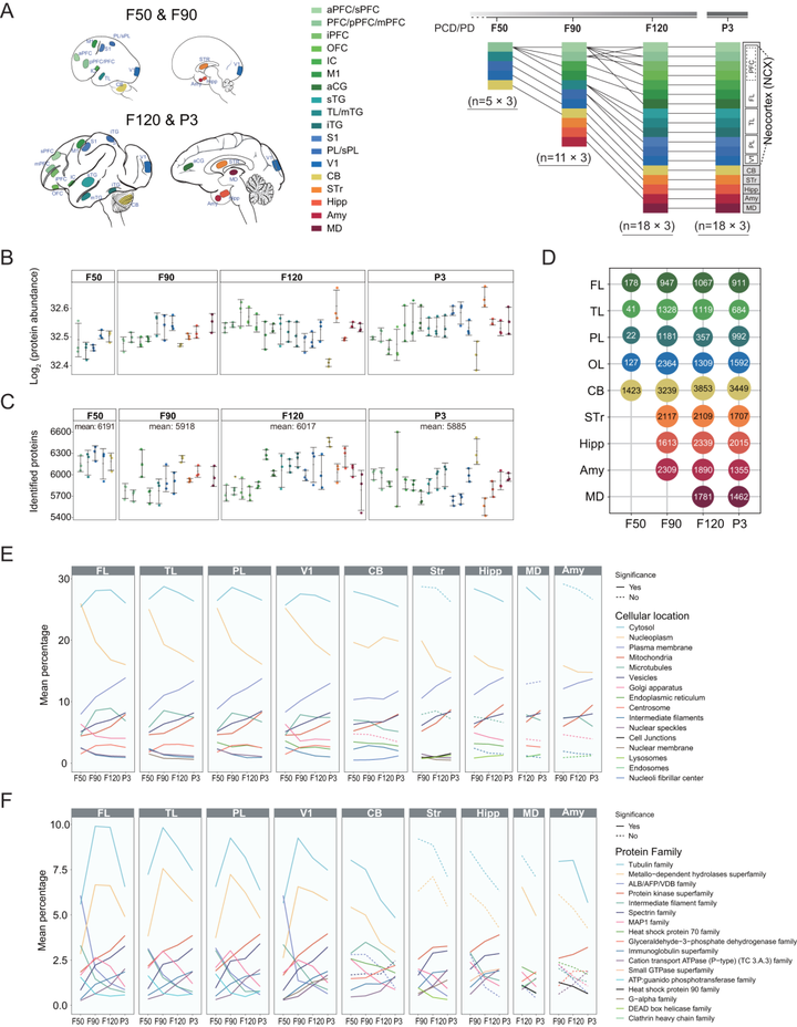 1. 食蟹猕猴胎儿大脑发育不同阶段的时空蛋白质组学研究猕猴被认为是研究人脑的理想的非人类灵长类动物模型。研究者选取了食蟹猕猴胎儿发育过程中神经发生和皮质扩张期间的四个阶段:受精后50天、90 天和 120 天(F50、F90 和 F120)以及出生后 3 天(P3)。并对12个大脑组织(每个阶段3个生物学重复)的前脑样本中与高阶认知和行为相关的1个解剖大脑区域,共156个脑组织样本进行采样(样本策略),进行时空蛋白质组学检测(质谱策略)。研究者在156个样本中,共鉴定到9286种蛋白质,平均每个样本中鉴定到5967种蛋白质(5423-6600种蛋白质)。四个阶段中,平均每个阶段中鉴定到6002种蛋白质(5885-6191种蛋白质)。