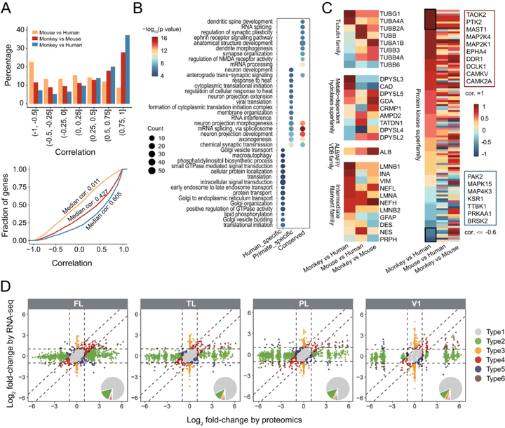 研究者比较了五个出生后3天猕猴大脑区域(STR、MD、HIPP、mPFC和小脑组织)和处于相似发育阶段的人类和小鼠蛋白质组数据。研究者发现,人类特异性蛋白主要富集在高尔基体囊泡运输、巨自噬等方面。灵长类动物特异性蛋白主要富集于神经元发育、顺行跨突触信号传导等方面。研究者还进一步分析了三个配对比较下五个区域中前10个丰富蛋白质家族的相关性。猴子与人类的数据比小鼠与人类、猴子与小鼠的蛋白质表达更为相似,并且揭示了人类和猴子之间几个特定蛋白质丰度存在显著差异。鉴于猕猴与人类之间的物种特异性和相似性,这些数据对于了解人类大脑发育具有重要的科学价值。此外研究者将产前(F120)和产后(P3)食蟹猕猴大脑组织的蛋白质组数据变化情况与之前发表的猕猴产前(F110)和产后(P2)阶段转录组数据进行了比较,揭示了RNA和蛋白质水平之间的差异以及转录后调控的特征。结果显示,一定比例(>15%)的基因的mRNA和蛋白质水平存在显著差异,强调了大脑发育研究中蛋白质组学研究的重要性。