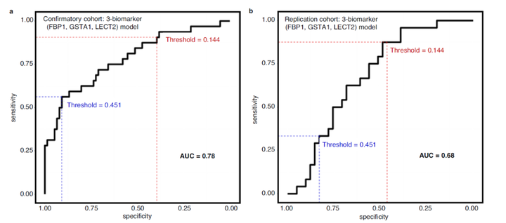综上所述,研究者通过大型多中心病例对照研究,使用蛋白质组学技术以及后续的生信分析揭示了基于FBP1+GSTA1+LECT2的预测模型可以识别DILI和非DILI肝病,凸显出了蛋白质组学技术在DILI临床研究中的重要作用。