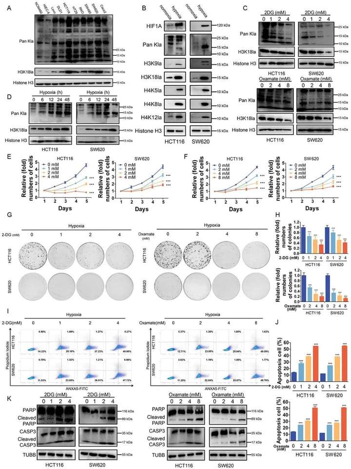 研究者首先通过转录组数据分析及免疫组织化学染色实验,发现受贝伐珠单抗治疗的稳定性疾病(SD)/进行性疾病(PD)患者的糖酵解信号显著富集,且与正常结肠上皮细胞系相比,CRC细胞系中乳酸化和H3K18la水平明显升高,表明乳酸化和H3K18la水平的升高可能导致对贝伐珠单抗的耐药,这可能与结直肠癌患者的低生存率相关。而后通过使用组蛋白乳酸化抗体检测发现,在缺氧条件下,H3K18la水平明显升高,糖酵解抑制剂在CRC细胞中呈现出胞内乳酸水平显著剂量依赖性降低的现象。进一步研究发现,抑制组蛋白乳酸化可以有效抑制结直肠癌细胞的增殖、集落形成。