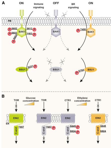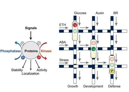 3. 蛋白质磷酸化修饰参与信号通路调控最近的研究表明,多种植物上游信号中存在不同的磷酸化修饰位点(又叫做磷酸代码,phosphocodes),可以进一步触发其下游信号通路。研究者发现,不同上游信号激活同一个蛋白组的不同phosphocode,而不同的phosphocode可以打开或关闭特定的下游信号通路。植物利用phosphocode的开关来确定打开或关闭那个信号通路,对植物在复杂环境生存和生长具有重要作用。