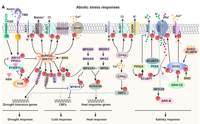 2. 蛋白质磷酸化在植物适应环境过程中的作用非生物(干旱、洪水、温度等)和生物胁迫(真菌、细菌、病毒等)都会对植物生长发育构成重大威胁。研究表明植物可以通过蛋白质磷酸化过程将外部信号转导为细胞内反应。在非生物胁迫情况下,应激激素ABA、信号中枢MAPK、钙依赖性蛋白激酶CPKs和盐敏感响应因子SOS均发挥着重要作用,这些因子相应的信号转导主要依赖于一系列磷酸化反应,进一步引发植物对于胁迫的系列反应,如寒冷、高盐、高热、干旱等非生物胁迫。因此,蛋白质磷酸化修饰在植物非生物胁迫响应过程中发挥了广泛且重要的作用。