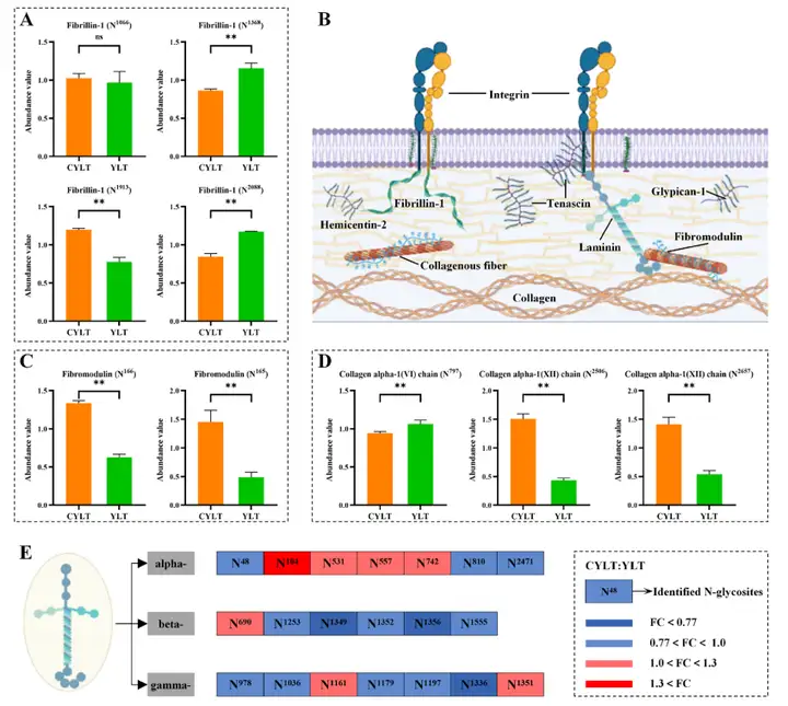 之后,研究者选择了两类重要的N糖蛋白,即细胞外基质(ECM)中的各种糖蛋白和影响肌肉老化过程的蛋白水解酶,探索了糖基化修饰影响犏牛和牦牛肉质差异的原因。研究发现犏牛和牦牛肌肉组织中几种ECM相关蛋白(如原纤维蛋白-1、胶原蛋白、纤调蛋白聚糖、层粘连蛋白)的N-糖基化存在显著差异,这些差异会影响结缔组织的结构和弹性、肉质嫩度和质地变化、屠宰前受到的氧化应激反应以及肉质分子稳定性,进而影响牛肉品质。此外,犏牛中几种溶酶体相关蛋白水解酶(组织蛋白酶、溶酶体蛋白酶、氨肽酶和磷脂酶)的N-糖基化水平显著升高,其可能通过影响肌肉结构、蛋白降解,进而导致宰后的肉质变化。