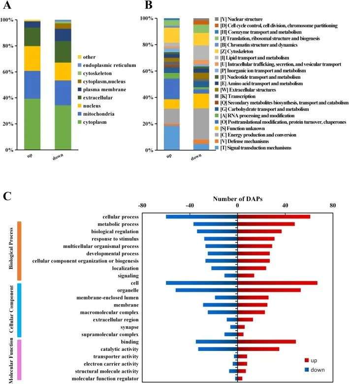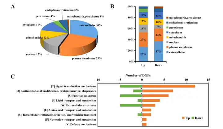 该研究在牦牛和犏牛的胸最长肌组织中共定量到发生在181个N-糖基化蛋白上的252个N-糖基化位点,其中含有76个差异N-糖基化蛋白。亚细胞定位结果显示大多数糖基化修饰差异蛋白定位在胞外结构域和细胞质膜上,这与糖蛋白的胞外特性一致。同时,研究者还发现犏牛胸最长肌中丰度增加的差异N-糖基化蛋白更多分布在血浆中,丰度降低的差异N-糖蛋白更多分布在胞外结构域和细胞质中。差异N-糖基化蛋白的位置分布特性可能影响其功能差异。此外,CYLT和YLT的N-糖基化蛋白在功能方面存在显著差异,犏牛中丰度上调的差异N-糖基化蛋白更多分布在信号转导,翻译后修饰、蛋白质转换、伴侣蛋白的KOG亚类上。