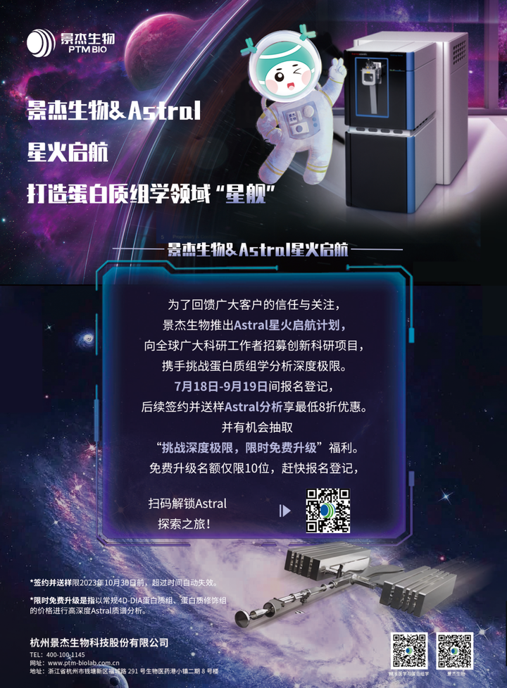 为了回馈广大客户的信任与关注,景杰生物推出Astral星火启航计划,向全球广大科研工作者招募创新科研项目,携手挑战蛋白质组学分析深度极限。7月18日-9月19日间报名登记的客户,后续签约并送样(时间限2023年10月30日前)可享最低8折优惠。并有机会抽取“挑战深度极限,限时免费升级”福利(以常规4D-DIA蛋白质组、蛋白质修饰组的价格进行高深度Astral质谱分析)。免费升级名额仅限10位,赶快报名登记,解锁Astral探索之旅!