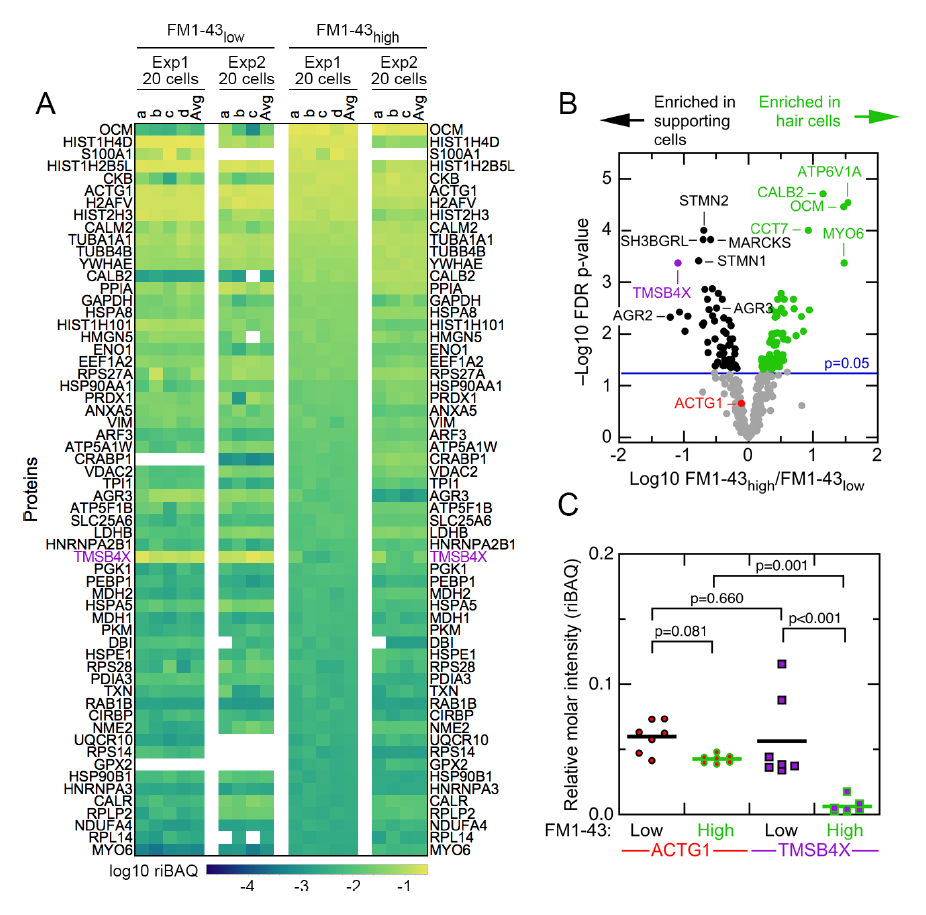 研究人员选取20个细胞量级进行进一步定量分析。样本中丰度最高的60种蛋白质如图3A所示,同时火山图分析表明,OCM和CALB2,以及分子马达MYO6在Hair cell中高表达, TMSB4X、STMN2、SH3BGRL和MARCKS在Support cell中高表达。单细胞蛋白质组学分析还发现了一些之前未被发掘的Hair cell特异蛋白,包括GSTO1、GPX2、CRABP1和AK1。TMSB4X的表征研究表明,作为胸腺素-β蛋白家族的一员,是肌动蛋白单体结合蛋白,在Support cell中结合大多数肌动蛋白单体。