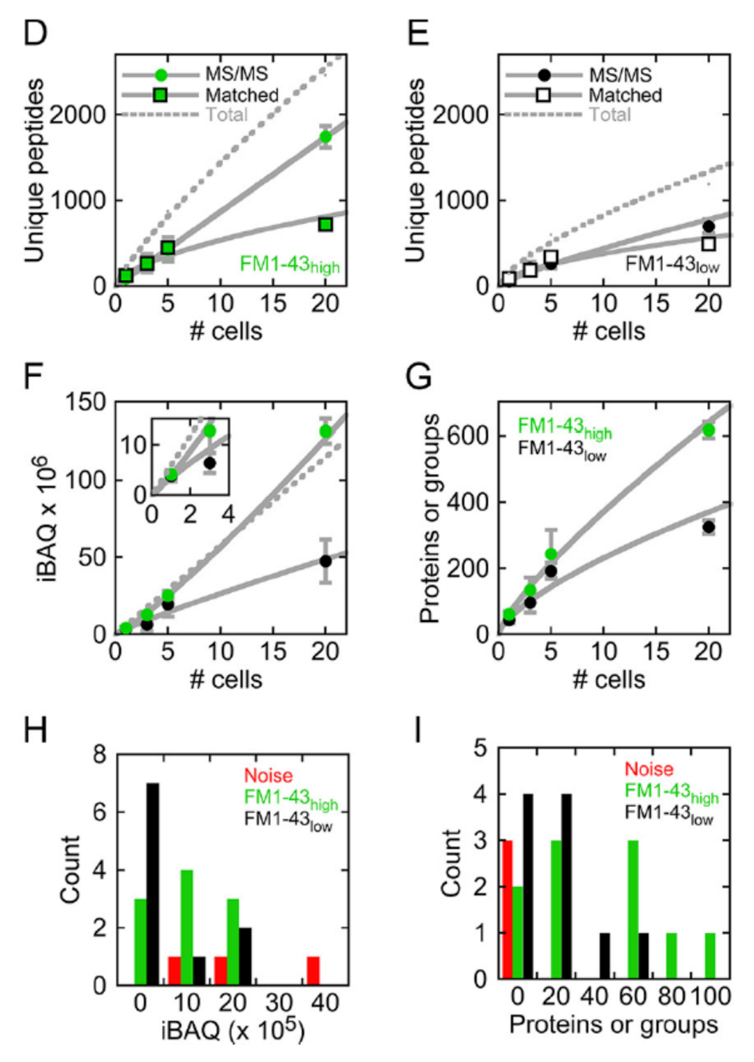 接下来,研究人员将分选后的细胞使用nanoPOTS方法进行样品前处理,然后使用基于质谱的单细胞蛋白质组学技术进行定量分析。在单个Hair cell中鉴定到60个左右的蛋白或蛋白group,而20个细胞量级下检测到近600个蛋白或蛋白group(图2G)。与之相比,Support cell中鉴定出的蛋白较少,可能是因为它们的体积较小。肌动蛋白和微管蛋白等细胞骨架蛋白的水平与大量蛋白质组学实验中的水平相似,表明了分析结果的可靠性。