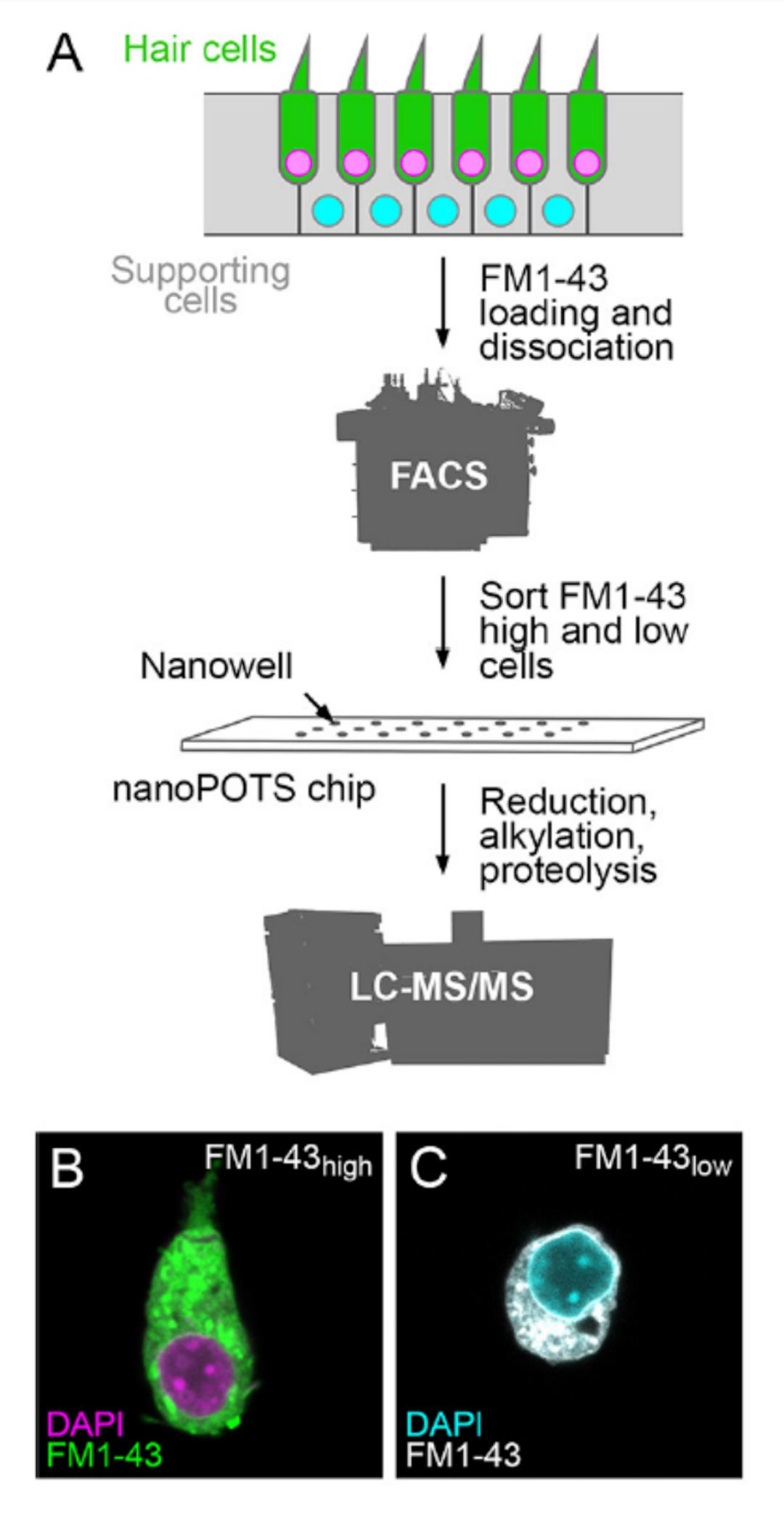 研究人员首先从E15鸡胚细胞样品中分离出Hair cell和它的祖细胞即支持细胞(Support cell),接着使用FM1-43荧光染料标记细胞(标记毛细胞的能力强于支持细胞),然后使用荧光活化细胞分选技术(FACS)进行细胞分选。收集到的高水平FM1-43(FM1-43high)的细胞具有毛束和细长的细胞体(图1B),这两者都是Hair cell具备的特征;相反,收集到的低水平FM1-43(FM1-43low)的细胞为支持细胞,呈圆形(图1C)。