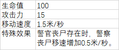 该种类怪物通常多个同时出现,并伴有警官丧尸。当警官丧尸死亡后,警察丧尸出现2秒硬直。
