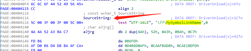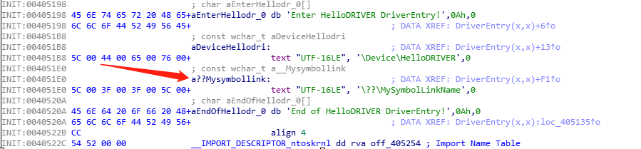 这个之前有#pragma alloc_text(INIT, DriverEntry)一句话,这个表明DriverEntry函数执行完毕后是会从页面中释放,变量字符串\??\MySymbolLinkName也是INIT标记,也会被释放,之前是\\,此处是\,是因为C语言字符串中\\代表一个\。